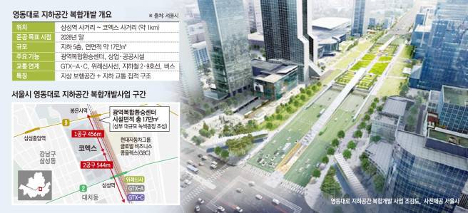 14일 서울시에 따르면 ‘영동대로 지하공간 복합개발’은 삼성역 사거리부터 9호선 봉은사역이 위치한 코엑스 사거리까지 약 1㎞ 구간에 지하 5층, 연면적 약 17만㎡ 규모의 광역복합환승센터와 공공·상업공간을 조성하는 사업이다.