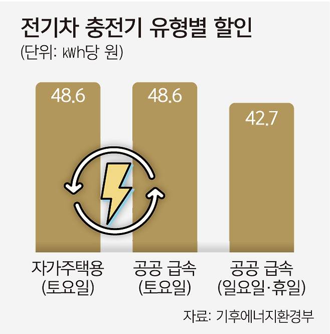 전기차 충전 할인은 자가 소비용 충전소 총 9만4000여기, 기후부와 한전이 운영하는 공공 급속 충전기 1만3000여기에 적용된다. 자가 주택용 충전기 충전요금은 1킬로와트시(㎾h)당 토요일 약 48.6원, 일요일 약 42.7원 할인된다. 공공 급속 충전기는 토요일 약 48.6원, 일요일?공휴일 42.7원이 각각 싸진다.