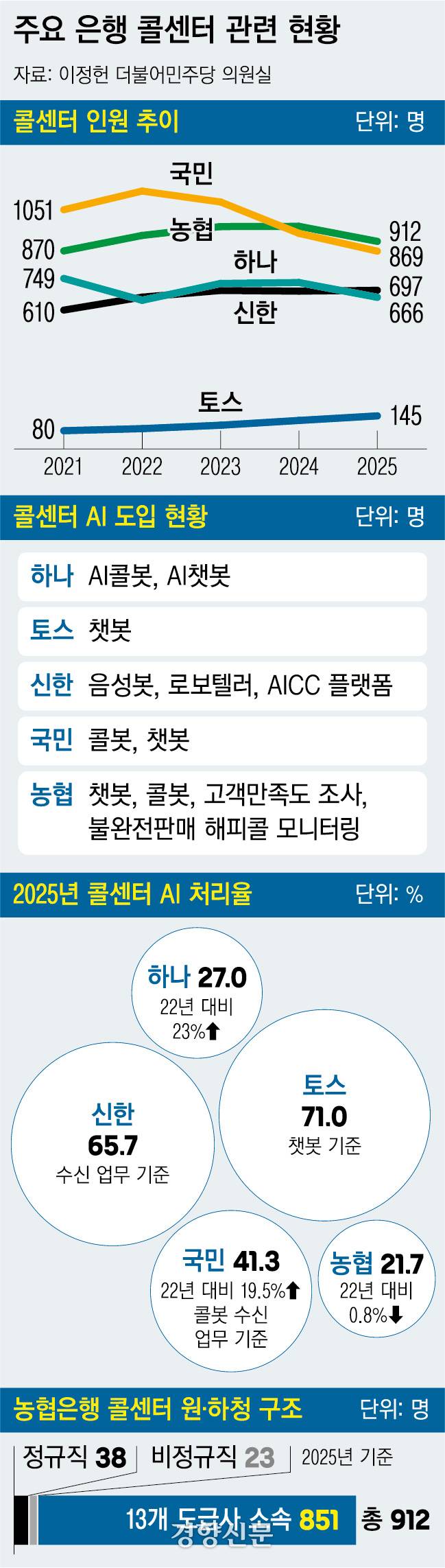 AI 도입이 늘고 있지만, 업무가 줄어든 것도 아니다. 최나영씨가 일하는 국민은행은 AI 처리율이 지난해 41.3%까지 올랐다. 그런데 최씨가 받는 콜은 오히려 늘었다. “예전에는 하루에 70콜이 적정 콜 수였다면 지금은 100콜, 120콜을 받아야 해요. 간단한 콜은 AI가 처리하다보니까 사람이 받는 콜은 더 어려운 것들만 남았어요.” 국민은행은 같은 기간 1133명이던 상담 인력을 2025년 869명으로 줄였다. 고난도 콜을 더 적은 사람끼리 나눠 받는 구조가 됐는데 처우는 변한 게 없었다.