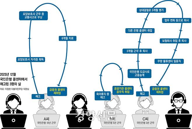 2023년 김지원씨(가명)는 일하던 콜센터에서 해고 통보를 받았다. 당시 6년차로 제법 숙련이 쌓였던 때였다. 국민은행 일을 도급받던 회사가 재계약에 실패해 김씨는 해고됐다.
