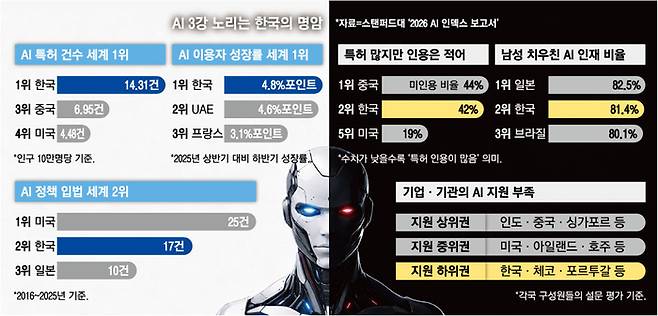 13일(현지시간) 미국 스탠퍼드대 인간중심AI연구소(HAI)가 발표한 ‘2026 AI 인덱스 보고서’에 따르면 한국은 인구 10만명당 AI 특허 건수가 14.31건으로 세계 1위를 기록했다. 지난해 상반기 대비 하반기 AI 이용률 증가폭도 4.8%포인트로 조사 대상 국가 중 가장 높았고 2016년 이후 AI 관련 법안 제정 건수는 17건으로 미국(25건)에 이어 2위에 올랐다. 산업 현장에서도 AI 확산 속도가 빠르다. 한국은 2024년 기준 산업용 로봇 설치 대수 3만600대로 세계 4위를 유지했다.