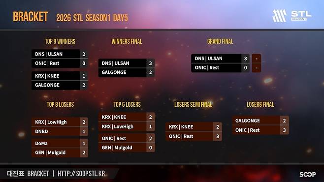 Day 5는 사실상 2026 STL S1의 마지막 일정이다. 그만큼 치열한 예선전이 펼쳐졌고 그 경쟁 속에서 DNS 울산, ONIC Rest, KRX KNEE, GALGONGE, KRX LowHigh, DNBD, DoMa, GEN Mulgold가 8강에 올랐다.