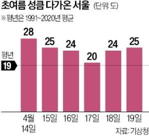 기상청에 따르면 이날 서울의 낮 최고기온은 28도로 평년(1991~2020년) 같은 시기 평균 최고기온인 19도보다 9도 높았다. 전날 낮 최고기온이 27.3도까지 올라간 데 이어 이날까지 이틀째 30도에 육박하는 더위가 이어지며 초여름을 방불케 했다. 일요일인 19일까지도 서울의 낮 최고기온은 25도 안팎으로 평년을 웃도는 더운 날씨가 계속될 전망이다.