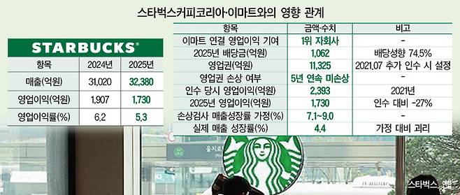 SCK컴퍼니의 이익률이 5%대 고착되면 이마트의 수익 구조에도 악영향을 끼친다. 스타벅스는 이마트 연결 실적에서 영업이익 기여 1위 자회사다. 지난해에도 2025년 배당으로 1062억원(배당성향 74.5%)을 지급했다. 2021년 7월 이마트가 미국 스타벅스 본사로부터 지분 17.5%를 추가 인수할 당시 설정한 영업권(약 1조1325억원)은 5년 연속 손상되지 않았지만, 수익성이 악화하는 게 문제다. 영업이익이 인수 당시(2393억원) 대비 27% 줄었는데도 영업권 상각을 하지 않았을 뿐이다. 글로벌 원두 가격 폭등에 따른 원가 부담을 상쇄할 만큼 매출 성장을 이뤄야 하는데, 2025년 손상검사에 적용된 매출성장률 가정(7.1~9.0%)보다 실제 매출 성장률(4.4%)이 낮은 실정이다. 가정과 현실이 벌어질수록 앞으로 영업권 손상 인식이 발생할 수도 있다.