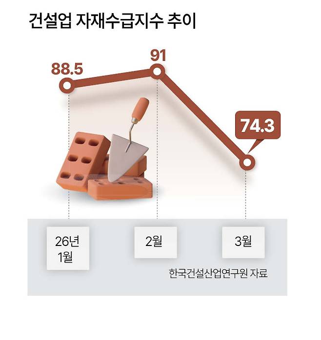 건설 자재수급지수 3월 74.3, 전월比 -16.7P
