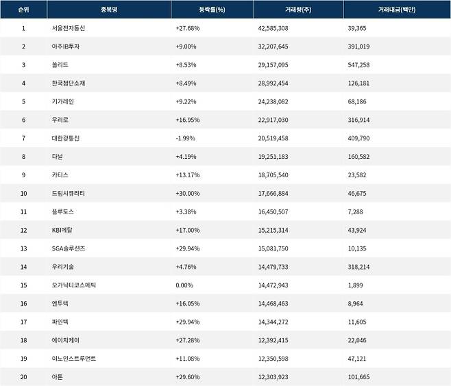 거래량 기준 상위 종목 가운데 서울전자통신(027040)은 4258만 5308주가 거래되며 가장 활발한 흐름을 보였다.