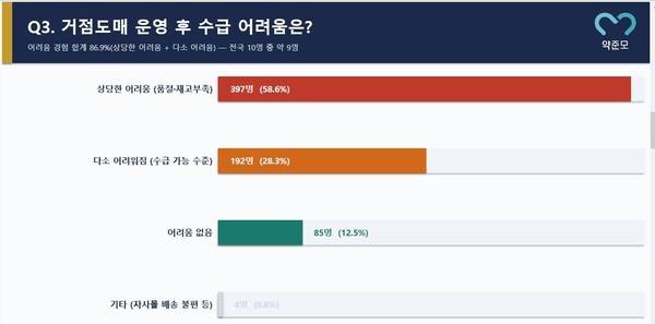 약준모가 전국 약국 678곳을 대상으로 지난 4월 6일부터 11일까지 실시한 설문조사에 따르면, 응답자의 86.9%가 의약품 수급에 어려움을 겪고 있다고 답했다. 이 중 58.6%는 '품절 및 재고 부족 등 상당한 어려움'을 경험한 것으로 나타났다.