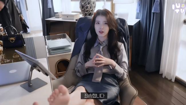 아이유, 책상 위에 맨발 ‘툭’…“불손하죠?” 촬영 중 사과 ('이지금')