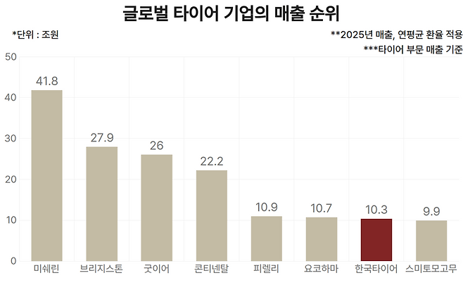 반면 상위권은 여전히 견고한 구조를 유지하고 있다. 1위 미쉐린은 41조8000억원, 2위 브리지스톤은 27조9000억원, 3위 굿이어는 26조원, 4위 콘티넨탈은 22조2000억원 규모로 중위권과 두 배 이상의 격차를 보이고 있다.