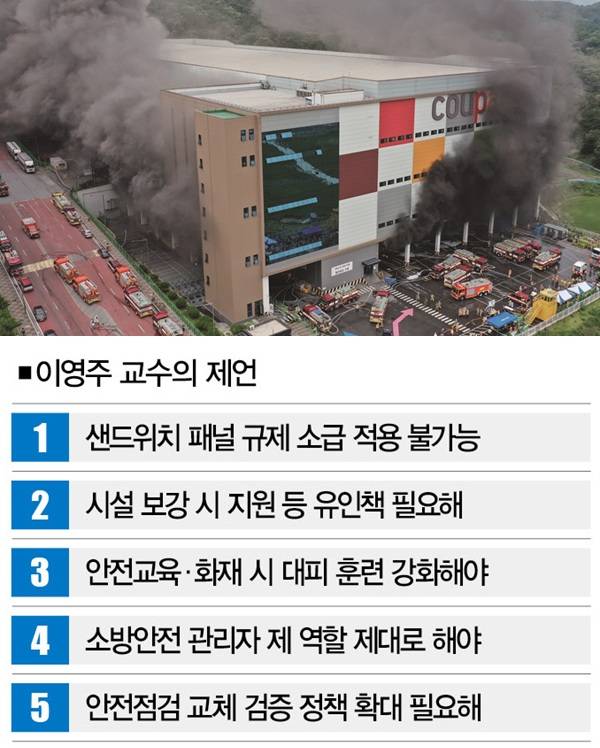 "원래 해야 할 일들을 정확하게 하면 된다. 어떤 건축물이든 소방안전 관리자가 있어야 한다. 이들의 역할이 바로 소방시설 점검, 화재 예방, 안전 교육 등이다. 이런 역할을 정확하게 하면 화재 가능성과 피해를 크게 낮출 수 있다. 여기에 근로자가 50명 이상인 공장(화학·금속 등 고위험군 30명) 등은 작업 현장의 안전 수칙 준수 여부를 확인하는 안전 관리자를 둬야 한다. 소방안전 관리자와 안전 관리자가 제 역할을 하면 샌드위치 패널 건축물의 안전도 충분히 확보할 수 있다. 없는 제도를 새롭게 만드는 것도 아니다. 원래 해야 할 일을 정확하게 하면 된다."
