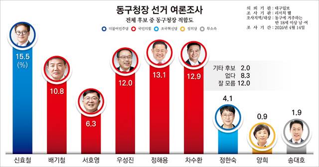 6·3 지방선거를 앞두고 실시된 대구 동구청장 후보 적합도 조사에서 더불어민주당 후보와 국민의힘 주요 후보들이 오차범위 내 혼전 양상을 보였으나 국민의힘 후보 지지율을 합산하면 국민의힘 후보 우세 구도가 확인됐다.