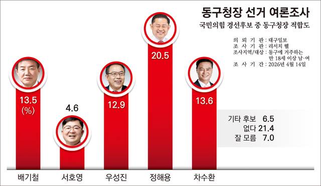 대구일보가 여론조사회사인 리서치웰에 의뢰해 지난 14일 대구 동구에 거주하는 만 18세 이상 남녀 501명을 대상으로 실시한 조사 결과, 국민의힘 경선후보 적합도에서 정해용 전 부시장이 20.5%로 1위를 기록했다. 차수환 국민의힘 대구시당 부위원장(13.6%), 배기철 전 동구청장(13.5%), 우성진 국민의힘 대구시당 부위원장(12.9%)이 2위권에서 초접전을 벌이는 것으로 조사됐다. 서호영 전 대구시의원은 4.6%로 상대적으로 낮은 수치를 보였다. '기타 후보' 6.5%, '적합한 후보가 없다' 21.4%, '잘 모름' 7.0%로 부동층 비중도 적지 않았다.