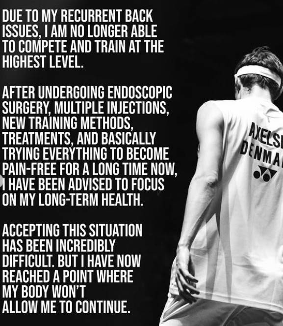 악셀센은 올 초 열린 세계배드민턴연맹(BWF) 월드투어 말레이시아 오픈(슈퍼 1000), 인도 오픈(슈퍼 750)에 허리 디스크를 이유로 연달아 불참하면서 은퇴 가능성이 거론됐다.