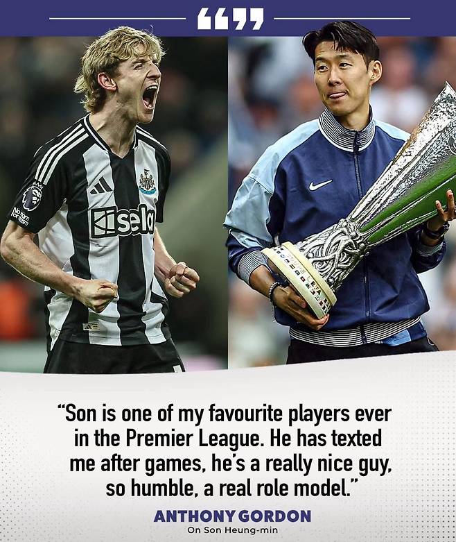 한편, 고든은 이전부터 꾸준히 자신의 롤모델로 손흥민을 꼽아왔다. 실제 그는 손흥민이 토트넘을 떠날 당시 잉글랜드 프리미어리그(EPL) 사무국이 손흥민을 헌정하는 콘텐츠를 진행했는데, 이때 “영감을 주는 선수”라며 “제 인생에 있어서 가장 뛰어난 공격수”라고 표현했다.