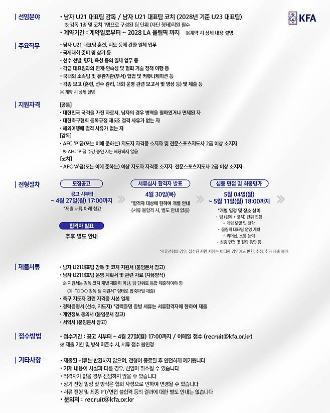 대한축구협회(KFA)가 2028 로스앤젤레스(LA) 올림픽에 참가할 축구 국가대표팀 감독과 코치를 공개 채용한다.