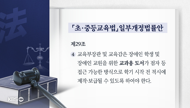 지난달 31일, '초·중등교육법 개정안'이 국회 본회의를 통과했습니다. A 양의 사례와 같은 일이 더 이상 반복되지 않도록 하겠다는 취지입니다. 개정안은 점자 교과서를 포함, 장애인 학생과 교원을 위한 '교과용 도서'가 학기 시작 전 적시에 제작·보급될 수 있도록 하여야 한다고 규정하고 있습니다. 또 이를 위해 교과서 발행자는 요청이 있으면 제작을 위한 '디지털 파일'을 30일 이내에 의무적으로 제출하도록 했습니다.