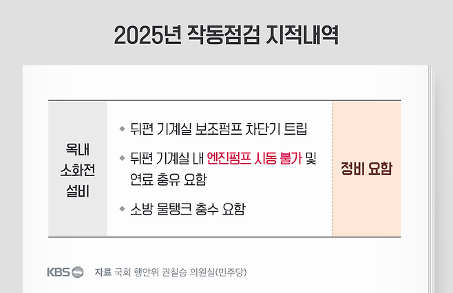 소방청 관계자는 KBS와의 통화에서 "시동이 걸리지 않는 건 자체 전동기 오류, 전기적 시스템 오류 등의 이유가 있을 수 있다"며 "펌프가 작동하지 않으면 아예 그 시설 자체가 무용지물이다. 중요한 문제이기 때문에 교체·수리 등 시정 보완 명령을 내렸을 것"이라고 말했습니다.