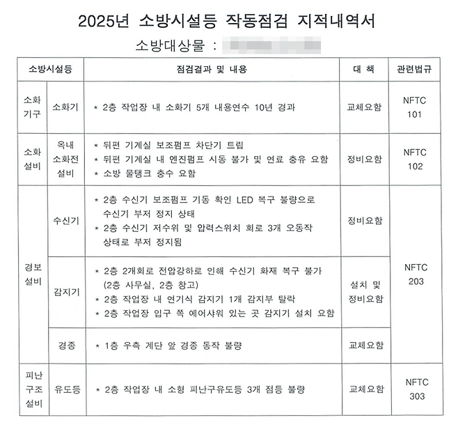 그 결과, 건물 내 소화전 설비가 '불량' 판정을 받았습니다.