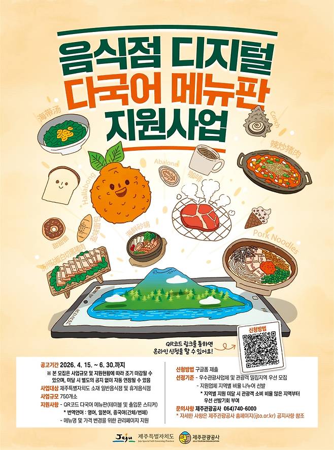 제주자치도와 제주관광공사는 15일부터 '디지털 다국어 메뉴판 지원사업' 참여 업소 모집에 들어갔다고 밝혔습니다.