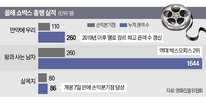 쇼박스는 지난해말 선보인 김도영 감독의 ‘만약의 우리’도 260만 관객을 동원해 손익분기점(110만 명)을 가뿐히 넘겼다. 조선 임금 단종의 마지막 4개월을 그린 장항준 감독의 ‘왕과 사는 남자’는 개봉 70여일만에 1642만명이 다녀가 국내 박스오피스 역대 2위(1위는 ‘명량’ 1761만명)에 올랐다.