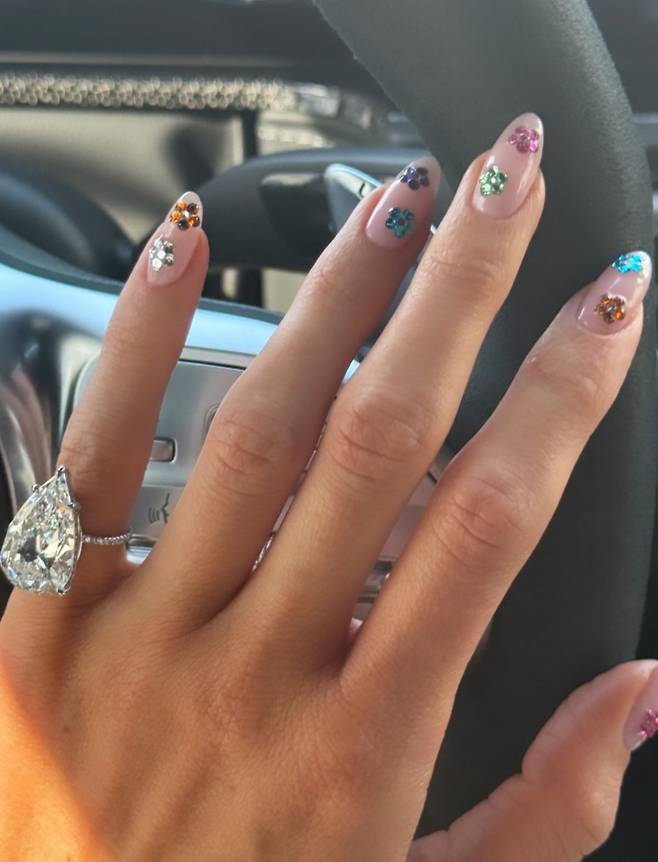 카일리 제너 의 네일 아트 역시 졸라 갠조릿의 손끝에서 완성됐습니다. 시럽처럼 묽은 누드 핑크 베이스 위에 알록달록한 크리스털을 얹어 플라워 패턴을 만들어냈죠. 핑크, 그린, 블루, 오렌지 톤의 반짝이는 포인트를 더해 한층 경쾌하고 러블리한 네일 아트가 탄생했습니다.