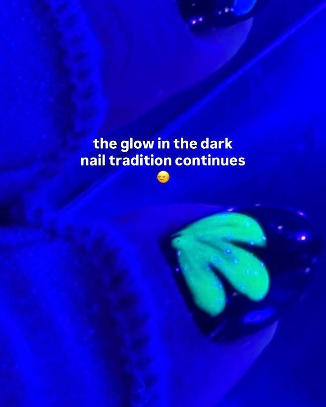 헤일리 비버 는 유경험자답게 네일 아트도 똑똑하게 선택했습니다. 블랙 컬러 베이스 위에 그린과 블루 톤의 플라워 모티프의 아트를 얹은 모양이었죠. 여기에 그만의 킥은 바로 낮과 밤의 반전을 노린 디자인입니다. 어두운 곳에서는 플라워 패턴이 야광처럼 빛나며 전혀 다른 분위기를 연출해주죠. 화려한 장식 대신 네온 포인트로 밤에 더욱 강렬하게 돋보이는 센스가 돋보이는 디자인입니다.