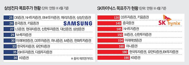 마찬가지로 SK하이닉스에 대한 기대치도 급상승했다. △하나증권 160만원 △한국투자증권ㆍ유안타증권ㆍIBK투자증권 180만원 △KB증권 190만원 등 목표주가를 상향 제시했다. 23일 실적발표를 앞둔 가운데 1분기 매출액 컨센서스는 전년 동기 대비 184.2% 증가한 50조1334억원, 영업이익은 369.1% 증가한 34조9035억원으로 형성돼 있다. 최근 분석 중엔 영업이익이 40조원을 넘을 수 있다는 전망도 많다. DRAM과 NAND 모두 평균판매단가(ASP)가 큰 폭으로 뛰고 있고, 인공지능(AI) 서버 확산으로 메모리를 단순 부품이 아니라 시스템의 핵심 요소로 봐야 한다는 논리다.