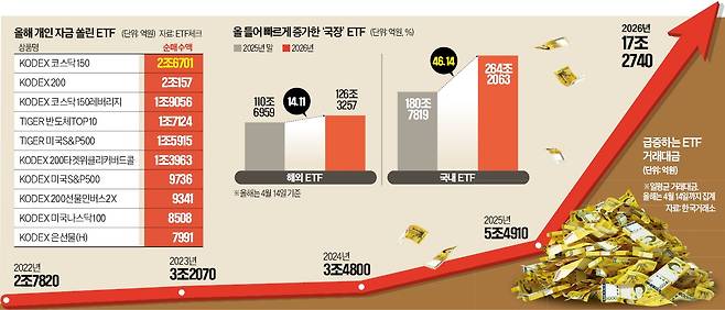 국내 상장지수펀드(ETF) 시장이 빠르게 몸집을 불린 데는 ‘국장 랠리’ 영향이 컸다. 지난해부터 국내 증시가 강세장을 이어가면서 개인투자자 자금이 국내 주식형 ETF로 물밀듯 들어왔다. 특히 올해 들어서는 유가증권시장뿐 아니라 코스닥시장으로까지 자금이 유입되는 흐름이 두드러졌다.