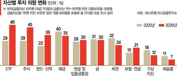 하나은행 하나금융연구소는 15일 부자들의 금융행태를 분석한 '2026 웰스 리포트'를 발간했다. 보고서는 부자(금융자산 10억원 이상) 713명과 금융자산 1억~10억원 미만 대중부유층 1355명, 금융자산을 1억원 미만 보유한 일반 대중 645명을 포함해 총 2713명을 대상으로 온라인 설문조사 및 인터뷰를 실시한 결과다.