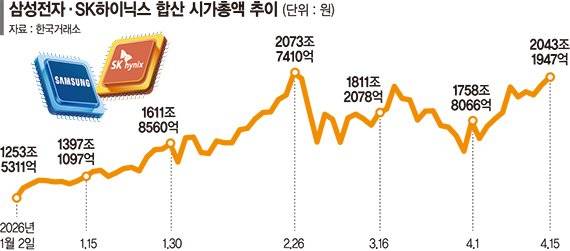 이날 종가 기준 삼성전자와 SK하이닉스의 합산 시가총액은 2043조1947억원으로, 한 달 반 만에 2000조원을 탈환했다.