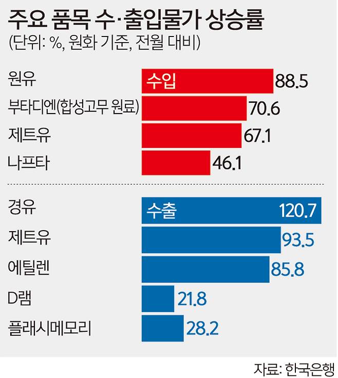원유 수입가 상승률은 ‘원화’ 기준 원유 품목지수를 작성하기 시작한 1985년 이래 최고치다. 계약통화(달러화 등) 기준 상승률(83.8%)은 1차 오일쇼크 당시인 1974년 1월(98.3%) 이후 52년2개월 만에 가장 높았다. 지난달 월평균 두바이유는 배럴당 128.52달러로 2월(68.40달러)보다 87.9% 뛰었다. 주간 종가 기준 월평균 원·달러 환율 역시 2월 1448.38원에서 지난달 1492.50원으로 급등했다.