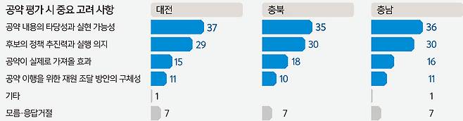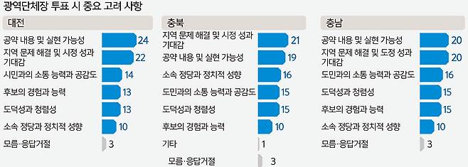 지난 10∼11일 충북도민 802명에게 이를 물었을 때는 21%가 성과 기대감, 19%가 공약 실현성을 꼽아 대전·충북·충남 모두 공약 실현성과 성과 기대감을 상위 고려사항으로 뒀다. 충북은 ‘소속 정당과 정치적 성향’이 중요하다는 응답이 16%였고 소통 능력 및 ‘도덕성과 청렴성’은 각각 15%로 집계됐다.