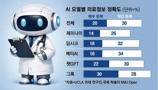 UCLA 의대 연구진의 최근 논문에 따르면, 널리 사용되는 5개 AI 챗봇들이 제공하는 의학적 답변의 절반가량이 근거가 없거나 부정확한 내용이었다. 연구진은 제미나이, 딥시크, 메타 AI, 챗GPT, 그록를 대상으로 조사했다.