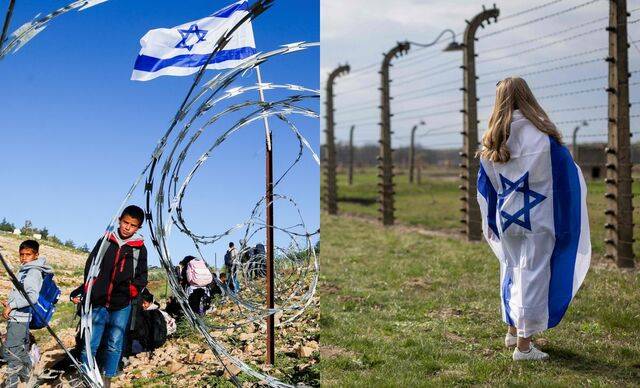 이스라엘이 점령 중인 요르단강 서안지구 마사페르 야타에서 14일(현지시간) 팔레스타인 학생들이 통학로를 가로막은 철조망을 따라 등교하고 있다. 마사페르 야타의 이스라엘 정착민들은 자신들의 거주 지역 일대에 철조망을 설치해 팔레스타인 학생들이 학교로 직행할 수 있는 지름길을 막았다. 오른쪽 사진은 같은 날 이스라엘 국기를 두른 한 추모객이 홀로코스트 추모일 ‘욤 하쇼아’를 맞아 폴란드에 있는 나치 독일의 아우슈비츠-비르케나우 유대인 수용소 옛터를 바라보는 모습. 로이터AFP연합뉴스