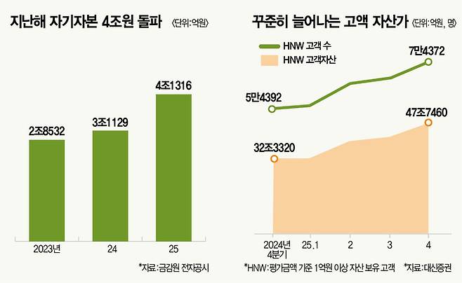 대신증권은 전통적으로 리테일과 자산관리(WM)에서 강점을 지닌 하우스로 분류된다. 지난해 4분기 기준 WM 부문 총자산은 108조원으로 집계됐다. 전년 동기 대비 38% 증가한 수준이다. 고액 자산가 유입으로 연금 자산이 꾸준히 확대되는 추세다. 지난해 4분기 1억원 이상 자산 보유 고객 수는 7만4400명으로 1년 전보다 37% 늘었다.