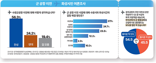 15일 중부일보가 한국여론평판연구소(KOPRA)에 의뢰해 지난 10~11일 화성시 거주 18세 이상 남녀 1천2명을 대상으로 실시한 여론조사(95% 신뢰수준에 표본오차 ±3.1%포인트) 결과에 따르면 '수원 군 공항 이전에 대해 어떻게 생각하는지'를 묻는 질의에 응답자의 56.3%가 찬성한다고 답했다. 반대한다는 답변의 비율은 24.2%, 잘 모른다는 19.4%로 각각 조사됐다.