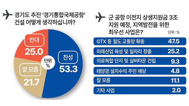 도로 및 철도 교통망 확충, 지역 주민 일자리 창출과 같은 충분한 보상이 이뤄진다면 '경기통합국제공항' 건설을 어떻게 생각하는지 묻는 질의에는 응답자의 67.4%가 반대 의견을 냈다. 찬성은 24.9%, 잘 모름은 7.7%였다.