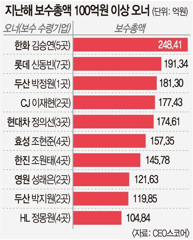오너 일가 중 보수 총액이 100억원 이상인 ‘회장님’은 10명으로 조사됐다. ‘연봉킹’은 김승연 한화그룹 회장으로, 지난해 한화그룹 5개 계열사에서 총 248억4100만원을 수령했다. 이어 신동빈 롯데그룹 회장(191억3400만원), 박정원 회장, 이재현 CJ그룹 회장(177억4300만원), 정의선 현대차그룹 회장(174억6100만원) 등 순이었다. 이재용 삼성전자 회장의 경우 2017년 3월부터 급여나 상여금을 받지 않는 ‘무보수 경영’을 이어오고 있다. 대신 삼성전자·삼성물산 등 계열사 주식 배당금으로 지난해 약 3993억원을 수령한 것으로 알려졌다.