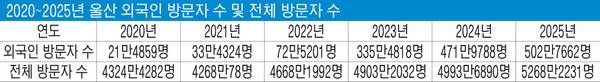 한국관광데이터랩의 분석 결과 지난해 울산의 외국인 방문자 수(연인원)는 502만7662명으로 전년(471만9788명) 대비 6.52% 증가했다.