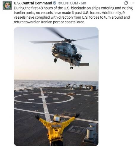 사령부는 전날에는 "첫 24시간 동안 어떤 선박도 미국의 봉쇄를 통과하지 못했으며, 6척의 상선은 미군의 지시에 따라 방향을 돌려 오만만에 위치한 이란 항구로 다시 진입했다"고 발표한 바 있다.