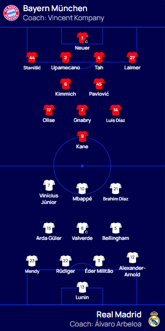 레알은 킬리안 음바페와 비니시우스가 있고, 뮌헨은 케인, 루이스 디아스, 마이클 올리세의 공격 라인이 강점이다.