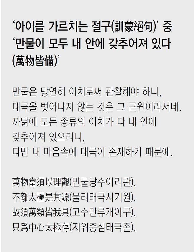 옛 학자가 ‘맹자’의 해당 구절을 내 몸에 천하만사가 갖춰져 있다고 해석하기도 했지만(趙岐), 시인은 사물의 물리적 실체가 내 안에 있다는 것이 아니라 우주 만물의 보편적 법칙이자 궁극적 원리가 인간의 마음속에 온전히 깃들어 있다고 읊었다. 시인은 연작의 다른 시에서 “이 이치가 우주 사이에 가득 차 있다(此理充盈宇宙間)”(‘鳶飛魚躍 一’)고 설명하기도 했다.