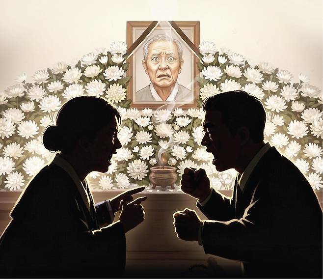 민법상 유언장 없이 사망하면 유산은 법정 순위대로 분배된다. 1순위 자녀, 2순위 부모, 3순위 형제자매 순이다. 배우자는 1·2순위와 공동 상속하며 50%를 가산받는다. 문제는 ‘기여도’다. 상속인 중 누군가 “내가 고인을 더 극진히 모셨다”거나 “재산 형성에 더 기여했다”며 유산을 더 받겠다고 나서는 순간 소송전이 시작된다. 상속 분쟁은 통상 변호사 수임료 등 1000만 원 안팎의 비용이 들고 결론까지 1, 2년이 걸린다.