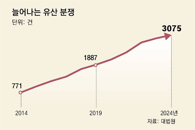 유언장을 남기지 않으니 자연히 분쟁도 늘고 있다. 대법원에 따르면 상속재산 분할 사건은 2014년 771건에서 2024년 3075건으로 크게 늘었다. 상속 전문 이양원 부천종합법률사무소 대표변호사는 “가족 구조가 파편화할수록 소액의 유산 분배도 유언장에 명확히 남기는 게 중요하다”며 “공공기관이 유언장 작성과 등록, 보관을 지원할 때가 됐다”고 했다.