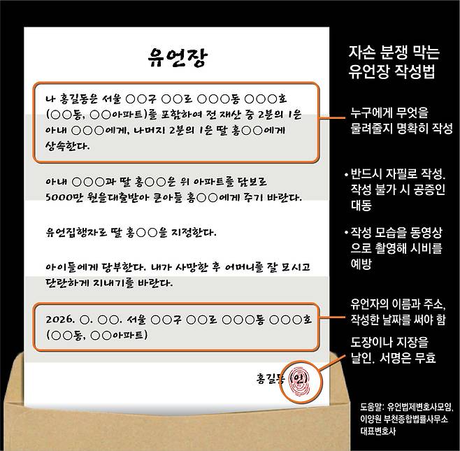 유언장은 젊을 때 작성해도 효력이 있다. 다만 내용을 바꿀 땐 자필로 고친 부분과 날짜를 표시해 날인해야 하고, 많은 부분을 고칠 거라면 기존 작성분을 폐기하고 새로 쓰는 게 낫다. 이 변호사는 “유언장은 사후 분쟁의 ‘백신’이나 다름없다”라며 “작성 시기는 큰 수술을 앞두고 있을 때나 삶을 정리해 보고 싶을 때 등으로 자유롭게 정하면 된다”고 했다.