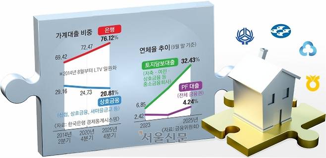 상호금융업권이 가계대출 규제 강화와 부동산 프로젝트파이낸싱(PF) 부실 여파에 동시에 직면하며 입지가 빠르게 좁아지고 있다. 과거 ‘풀뿌리 금융’으로 서민 자금을 공급하던 역할이 약화된 데다, 최근에는 수익성 확보를 위해 확대했던 PF 자산까지 흔들렸던 여파로 이중 압박에 놓였다는 우려가 제기된다.