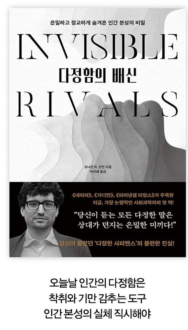 하지만 이 믿음에 사회과학자 조너선 R. 굿먼은 "과연 인간이 협력하는 이유가 이타심 때문일까?"라는 논쟁적인 질문을 던진다. 그는 저서 「다정함의 배신」에서 협력과 이타심으로 보이는 다정함이 실은 자원을 선점하기 위한 인간의 정교한 생존 기술이자 은밀한 전략이었다고 주장한다.