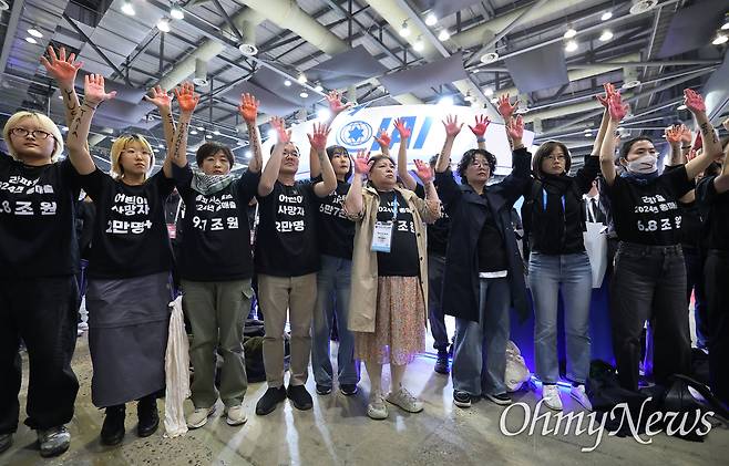 | ▲ 무기박람회저항행동과 국제앰네스티 한국지부가 21일 오전 서울 ADEX 2025(서울 국제 항공우주 및 방위산업 전시회 2025)가 열리고 있는 경기도 고양시 킨덱스 내 전시장에서 아덱스 비즈니스데이 액션(이스라엘 집단학살 공모 기업의 ADEX 2025 참가 규탄 퍼포먼스)을 하고 있다. 2025-10-21 |