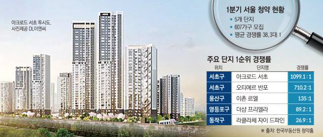 15일 한국부동산원 청약홈에 따르면 1분기 서울에서는 5개 단지 1순위 607가구 모집에 2만3234명이 몰리면서 평균 경쟁률이 38.3대 1을 기록했다. 1분기에는 강남권 분양이 없어 평소보단 낮았지만 전국 평균 4.4대 1은 크게 웃돌았다.