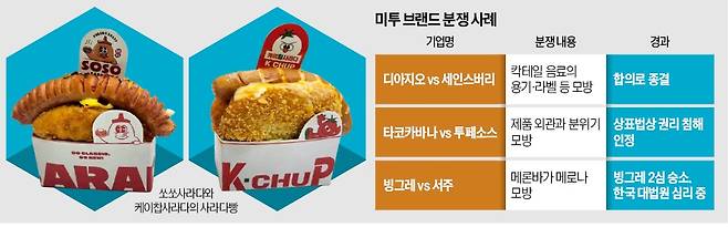 2017년 국내 프랜차이즈 업계에서 ‘핫도그 열풍’을 일으켰던 명랑핫도그의 미투(유사) 브랜드는 13개에 달했다. 수많은 카피 제품이 쏟아지는 와중에도 명랑핫도그는 핫도그 한 우물을 파 1년에 2000억원의 매출을 내는 프랜차이즈로 자리 잡았다. 최근 명랑핫도그는 처음으로 ‘막대가 꽂혀 있지 않은’ 빵 사업에 진출했다. 300가지가 넘는 튀긴 빵 메뉴를 테스트하며 연구·개발한 결과 나온 메뉴가 ‘사라다빵’이다. 지난해 11월 ‘쏘쏘사라다’를 선보였다. 하지만 두 달도 채 지나지 않아 포장 용기, 로고 디자인까지 흡사한 ‘케이찹사라다’가 나타나 가맹점을 빠르게 늘리기 시작했다.